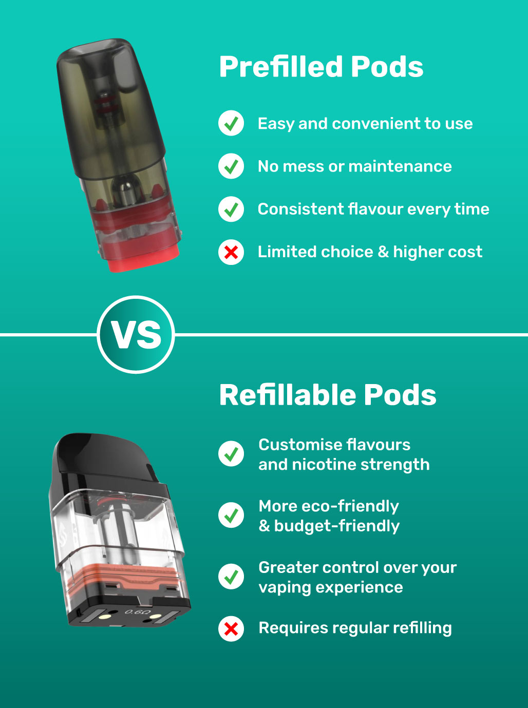 Refillable pods let you choose your e-liquid flavour and nicotine strength. They’re more cost-effective than prefilled pods but require regular filling and occasional coil or pod replacement.