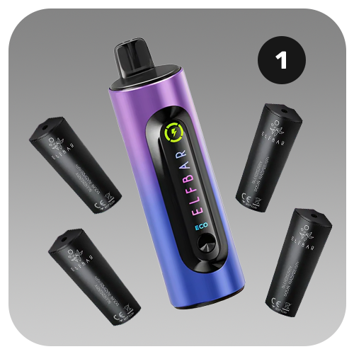 The Elf Bar 4 in 1 Pod Kit delivers up to 3,200 puffs in ECO mode (800 puffs per pod) and 2,400 puffs in NORMAL mode (600 puffs per pod). ECO mode reduces the device’s firing power, extending battery life and making each 2ml pod last longer. The Elf Bar 4 in 1 lets you customise your sessions with flavour-packed puffs.