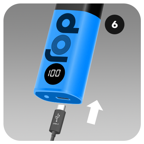 Use the USB-C port on the bottom of the device to charge it and the button to switch between NORMAL and TURBO mode.